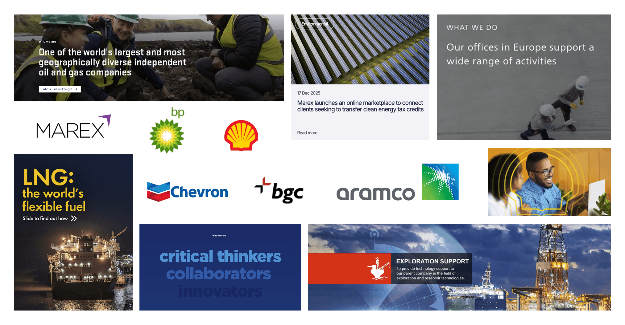 Visuals from the existing O&G market – corporate and industrial imagery; sans-serif, light typography (mostly); simple logos (with a lot of symmetry) and sans-serif wordmarks; Chevron and Aramco's visual identity looked the most visually consistent and engaging.