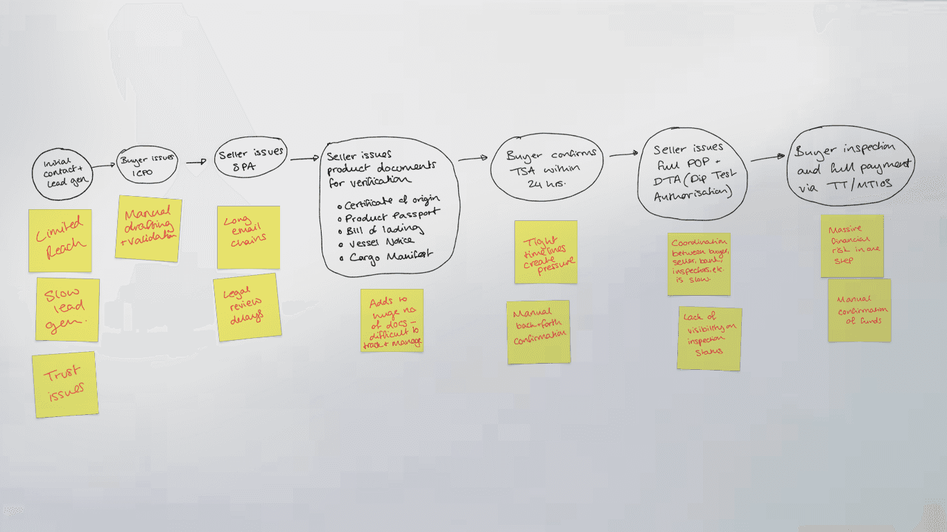 From the product perspective, we discussed in depth the problems in the O&G space. After speaking to brokers and key stakeholders in the industry, Shoaib and Abdurrahman noticed a pattern of pains: the process was too long, there's a huge amount of paperwork, and there is an increasing risk of fraud. They made it clear that buying and selling in the energy sector is archaic. It is fragmented, slow, and heavily reliant on intermediaries.